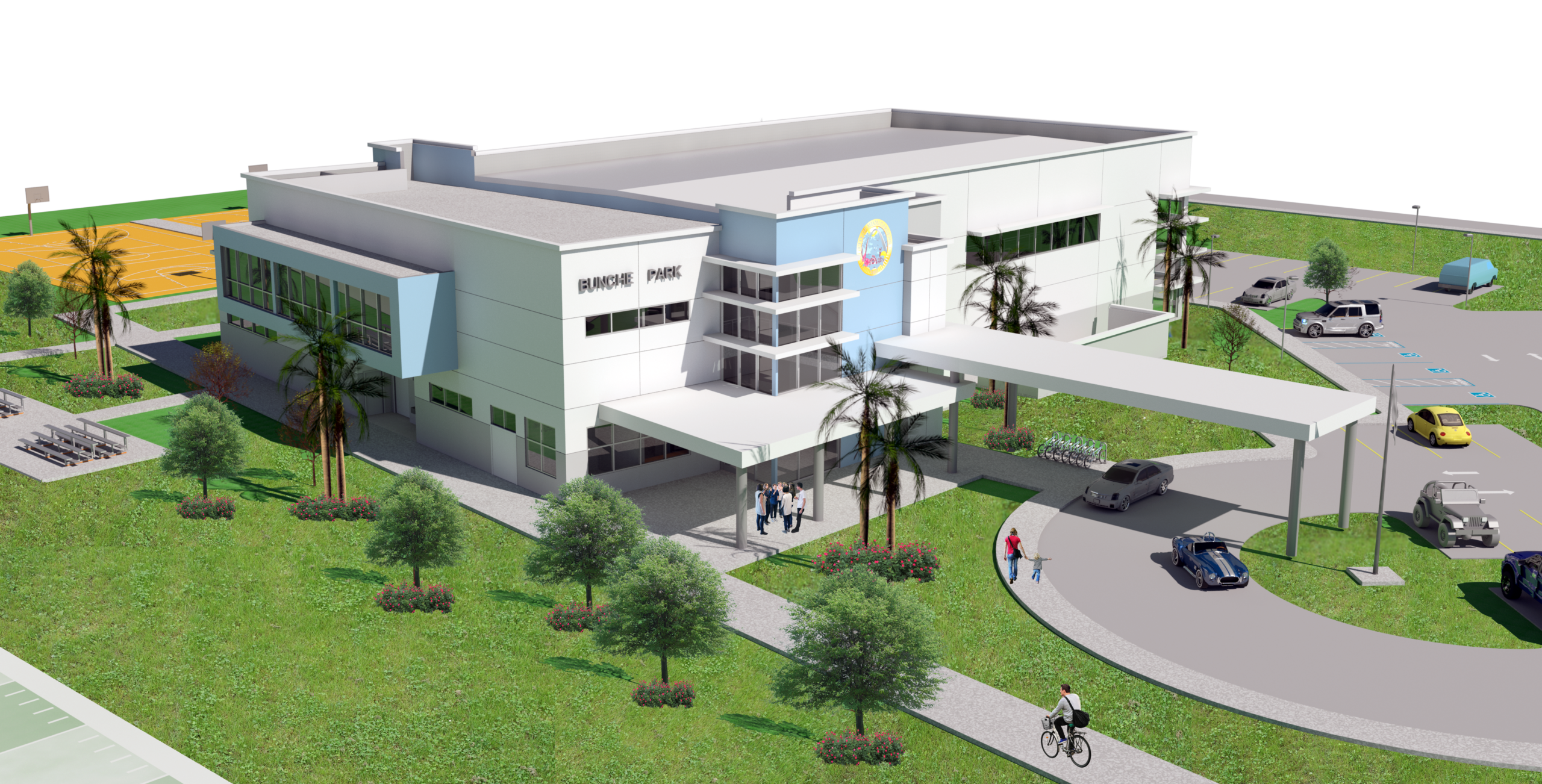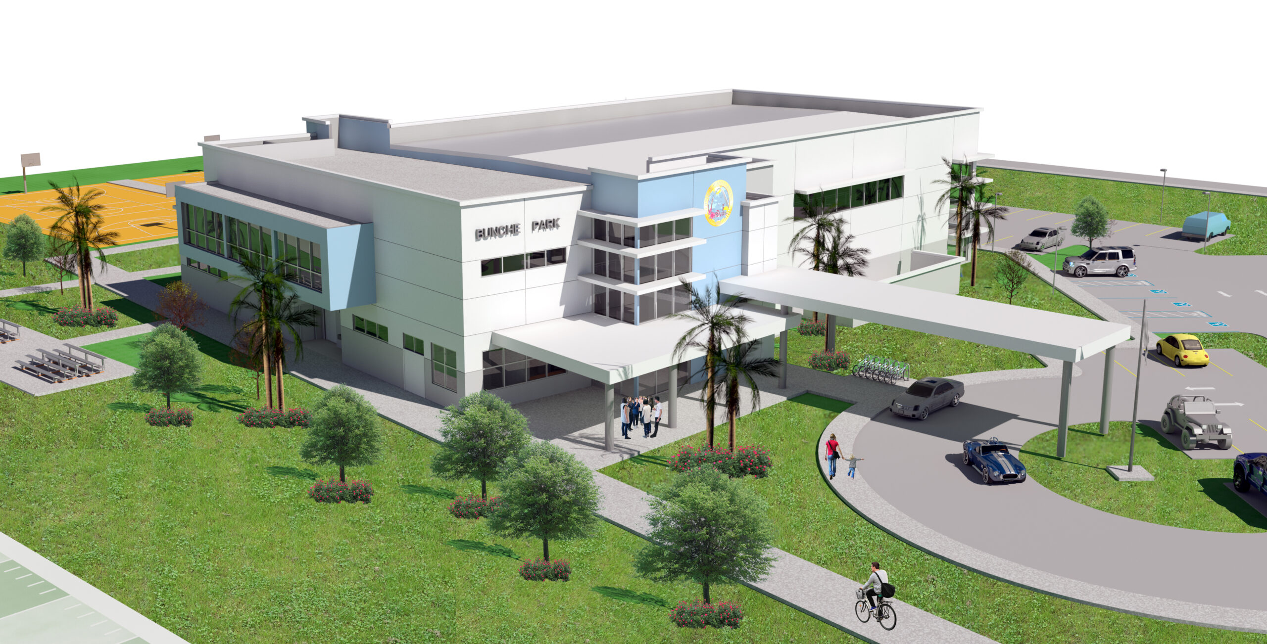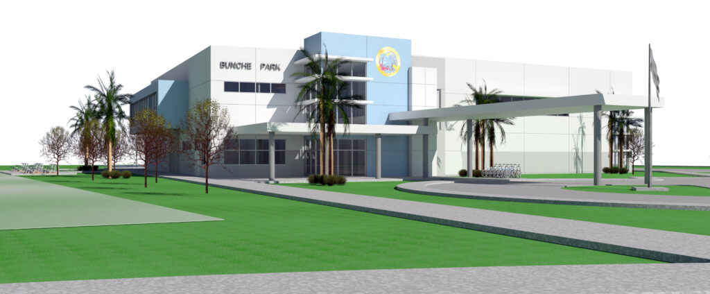 Bunche Park has been transformed into a dynamic recreational campus, blending athletic, educational, and community-focused spaces across a vibrant 7.24-acre site. At the heart of the park stands a striking 22,451-square-foot multipurpose gymnasium designed in a clean, modern architectural style. The building features a covered entry and drop-off area that welcomes guests into a series of versatile indoor spaces, including multipurpose studios and a fully equipped boxing training room.