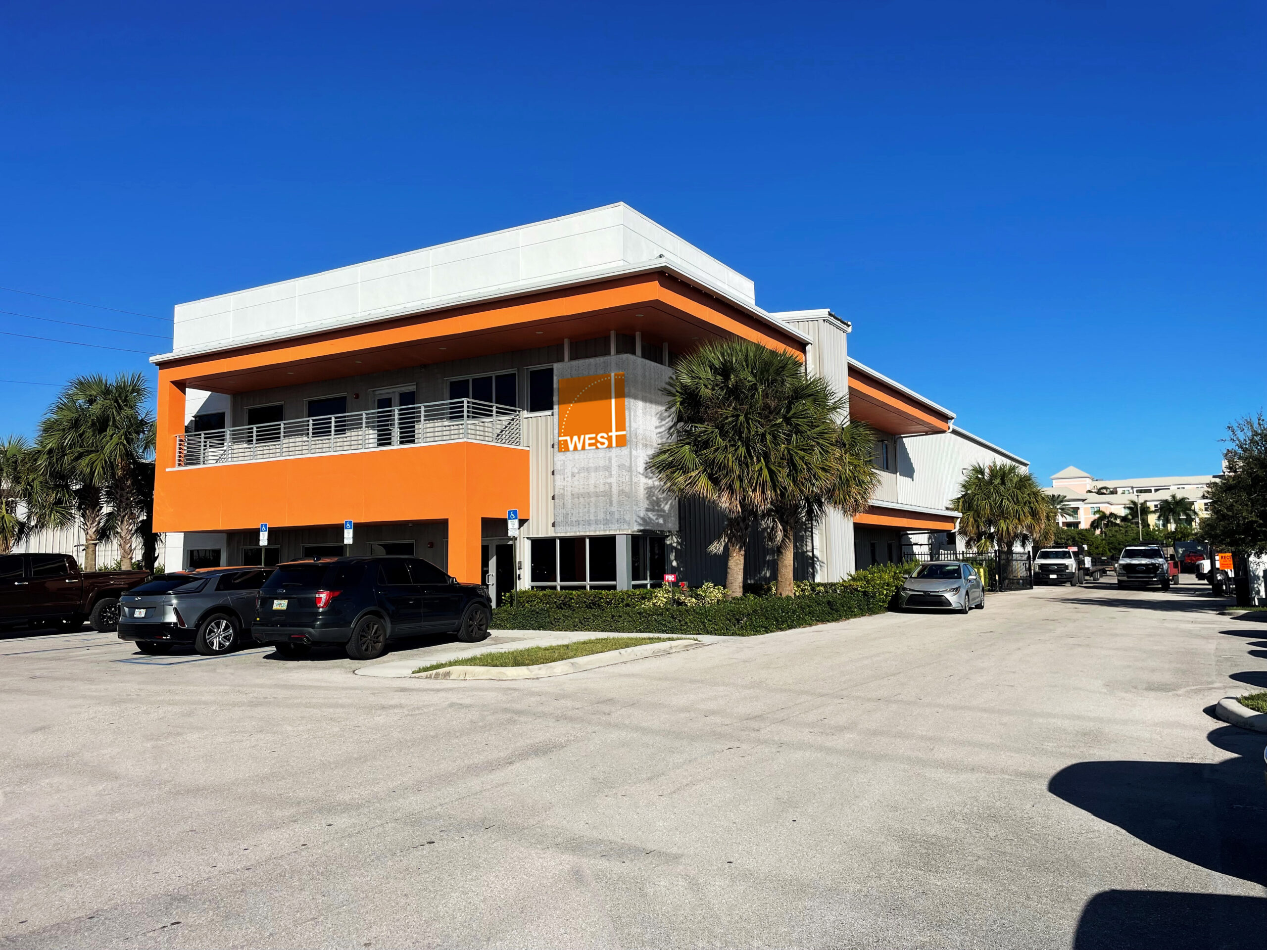This design/build project delivers a striking two-story office warehouse totaling approximately 19,550 square feet, executed in a bold Mid-Century Modern aesthetic. The pre-engineered metal structure features a covered balcony, vibrant color palette, expansive glazing, and industrial textures, all anchored by a custom perforated metal sign that contributes to the project’s strong street presence. Inside, a dramatic two-story lobby and monumental staircase lead to an upper-level balcony, infusing the workspace with natural light and architectural character.