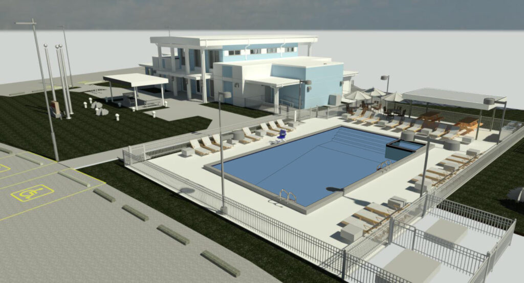 In addition to the interior improvements, the project will relocate the pool, spa, and deck to the front of the building, with an expanded deck area. New ADA ramps will ensure accessibility, and outdoor lighting, fencing, and landscaping will further enhance the overall user experience.