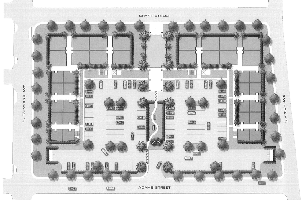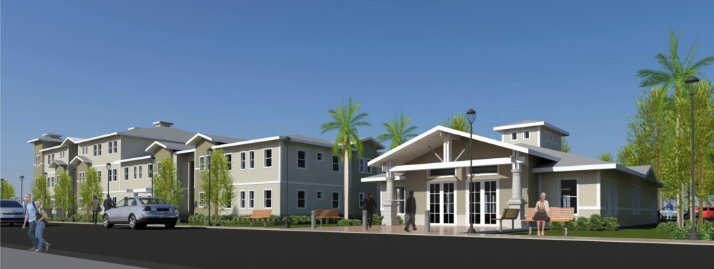 A centrally located Adult Day Care and Community Services building was positioned along Grant Street to serve as a focal point for resident engagement and neighborhood connectivity. Parking for 120 vehicles was incorporated into the site, including a designated drop-off area for resident convenience, with controlled access off Adams Street.
