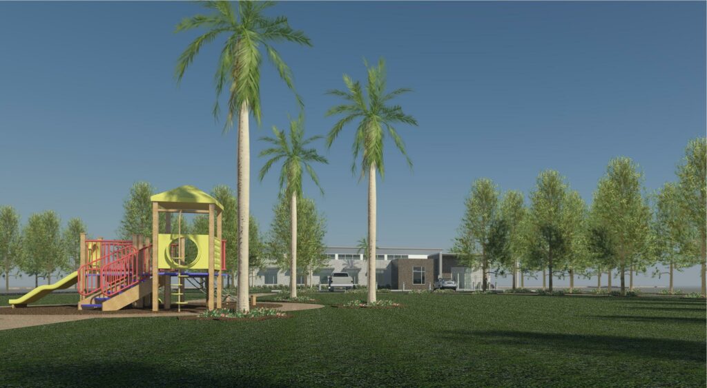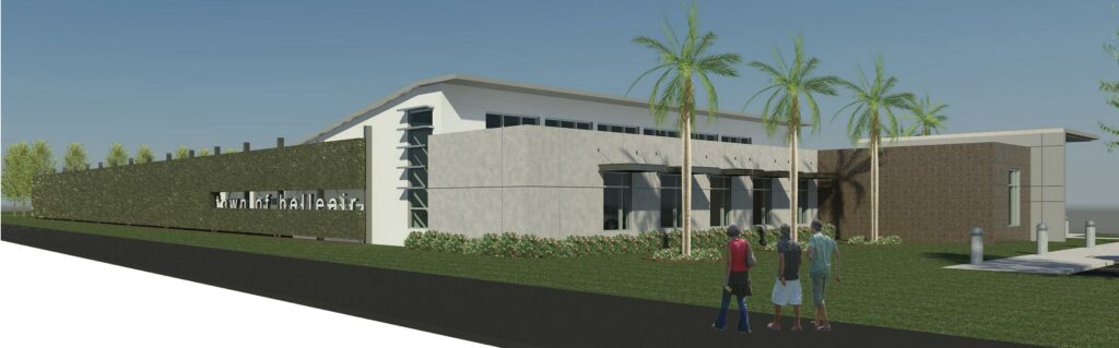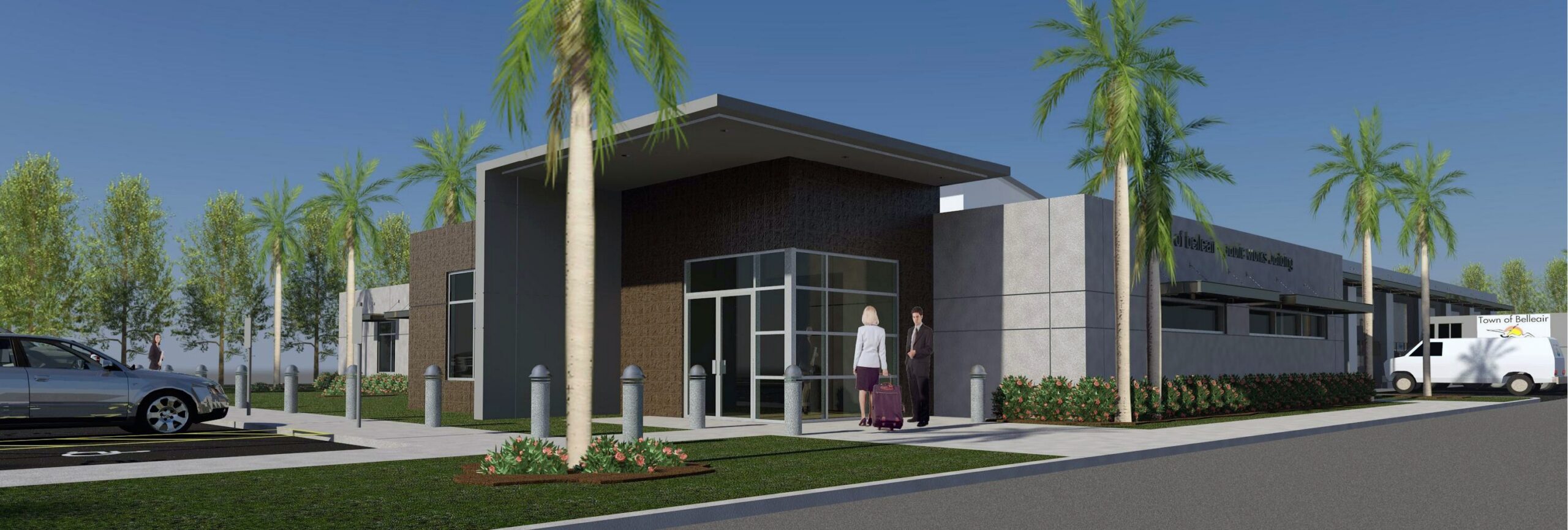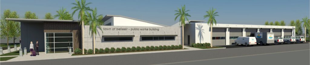 The Town of Belleair’s new Public Works Building is envisioned as a thoughtful integration of civic infrastructure and community connectivity. Designed as two intersecting one-story structures, the complex will span Belleair Avenue and be unified by a covered walkway that encourages movement and interaction between departments. The main administrative and workshop building is oriented east-west, featuring north- and south-facing openings to harness daylight while minimizing solar heat gain—an environmentally responsive strategy that reinforces long-term sustainability goals.