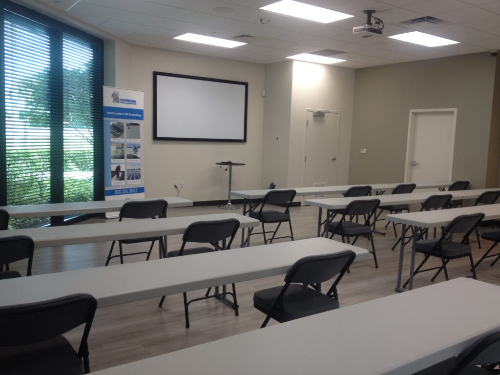The renovation began with essential repairs to the building’s systems, followed by an overhaul of the interior finishes and repainting of the exterior to align with Soprema’s branding. New offices and versatile conference/training spaces were introduced to support contractor education and industry seminars for professional organizations such as BOMA and AIA.