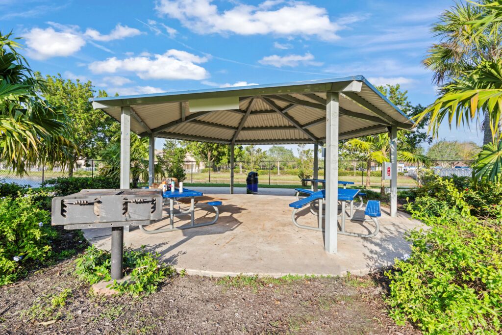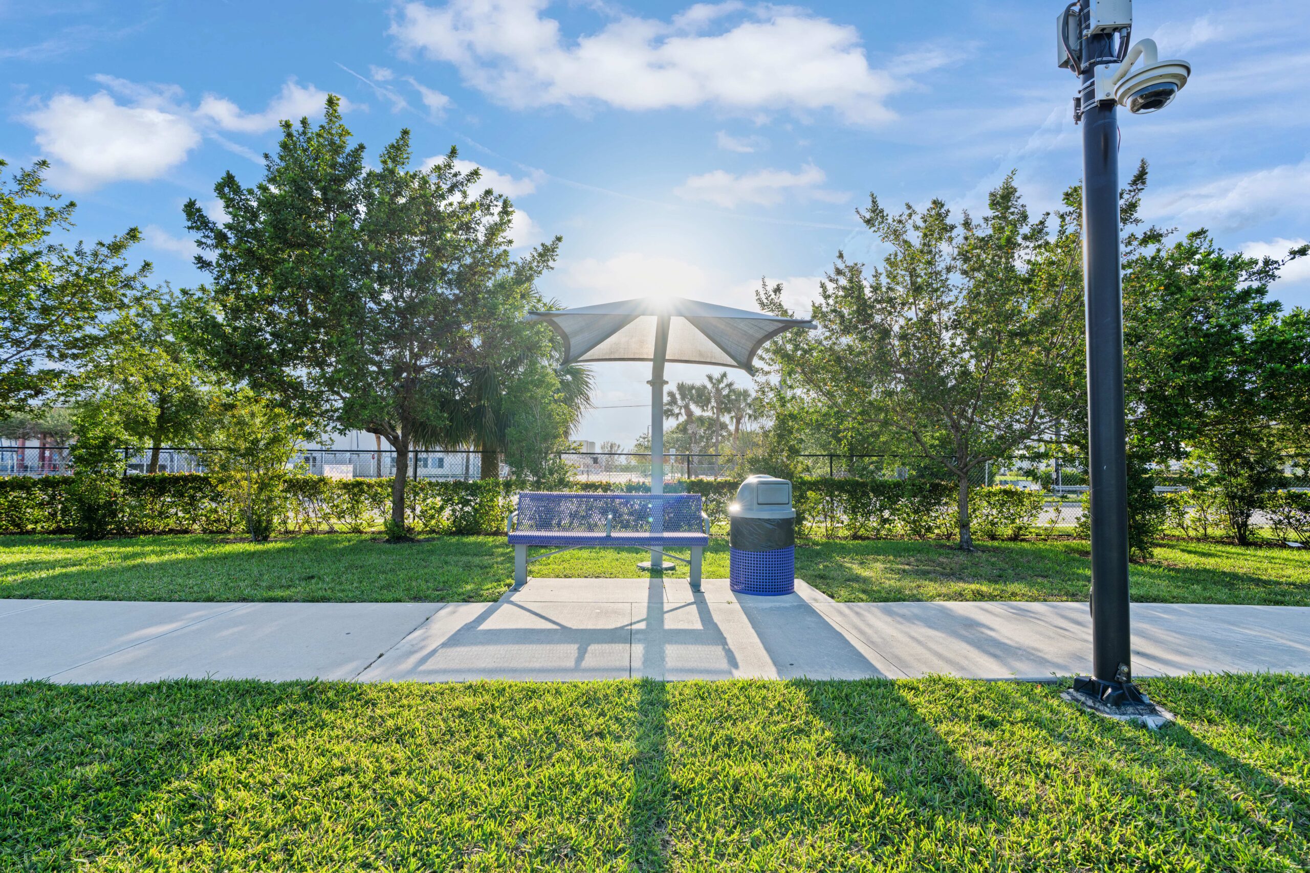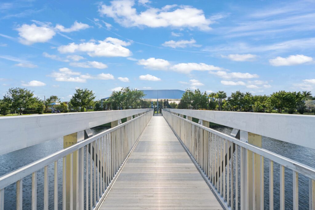 A meandering multi-purpose concrete path encircles the site, offering a scenic walking experience that links seamlessly with a pre-engineered pedestrian bridge. Spanning a canal, the bridge creates a direct connection to the nearby Tamarac Caporella Aquatic Center, expanding recreational access and promoting neighborhood walkability.