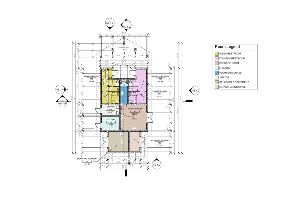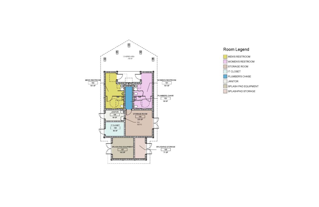 Inside, the layout includes public restrooms, a plumbing chase, a janitor’s closet, an IT room, and dedicated areas for splash pad equipment and storage. Each space was carefully planned to meet the operational needs of the park, seamlessly integrating with the themed setting while elevating the comfort and convenience for guests.
