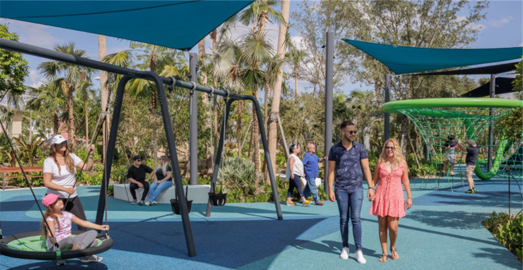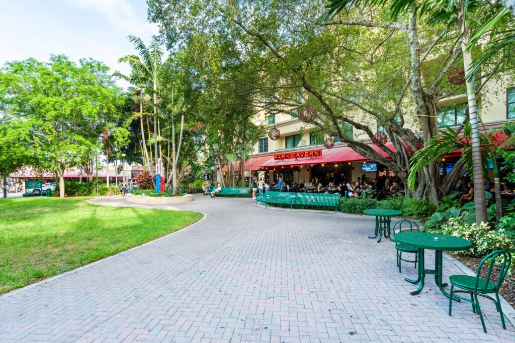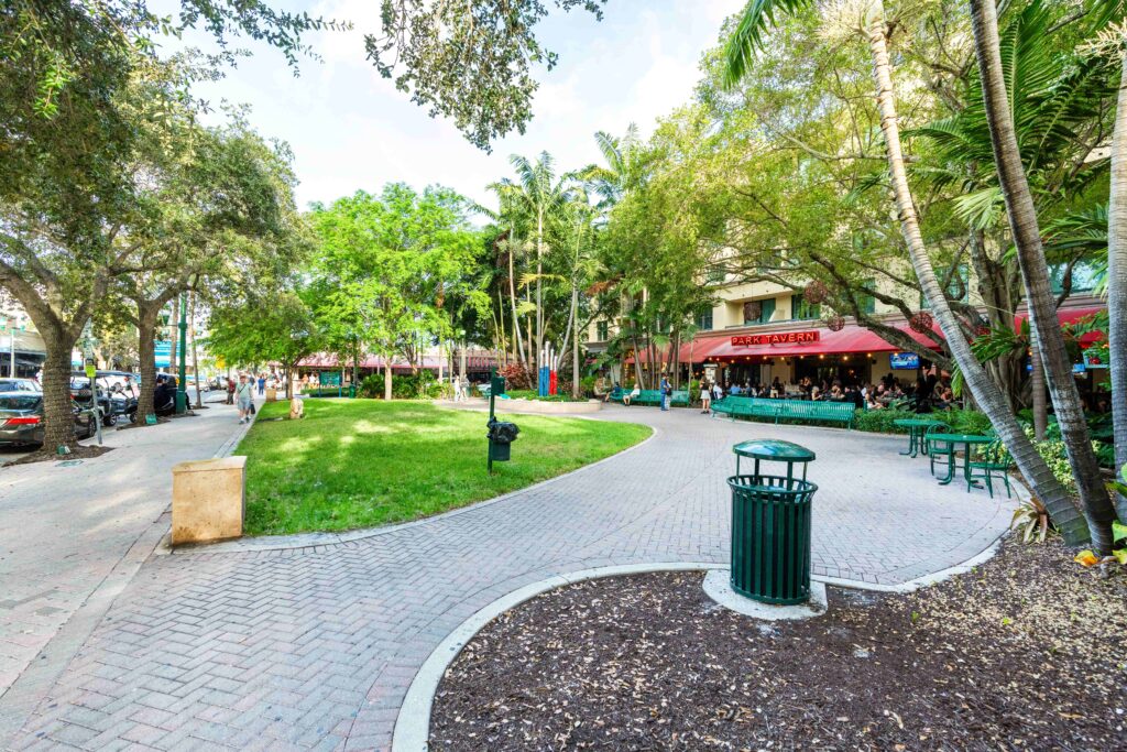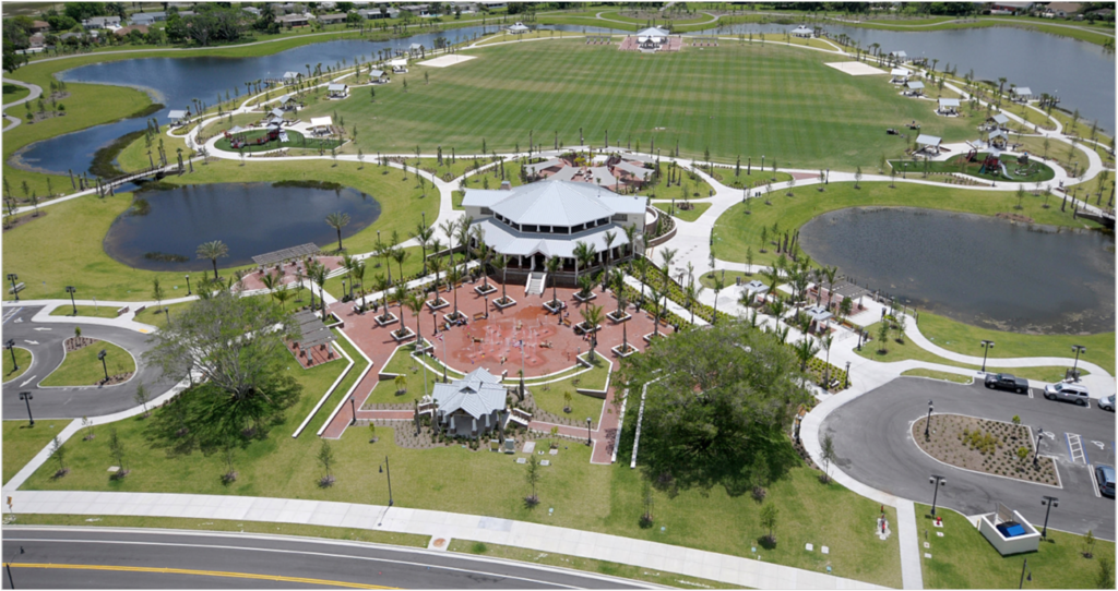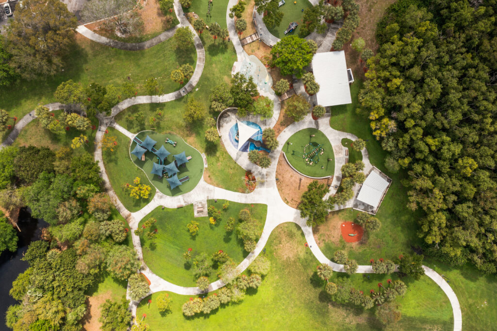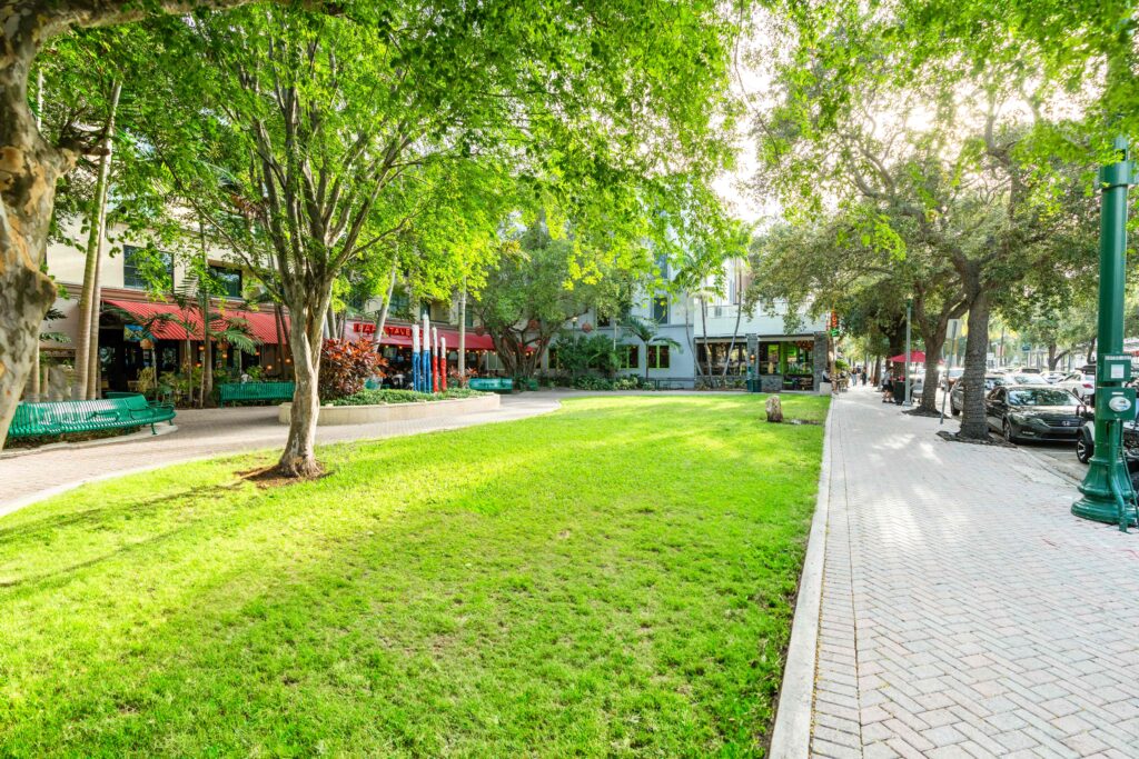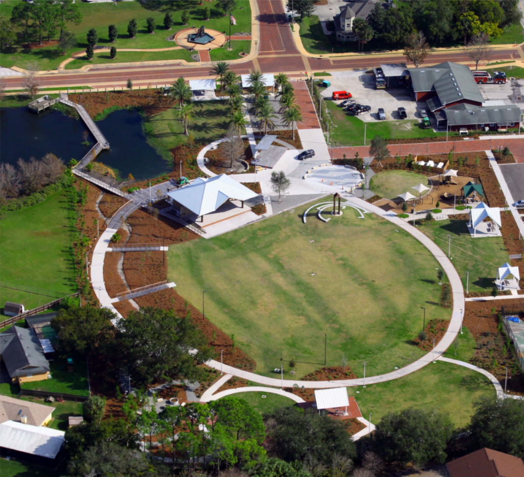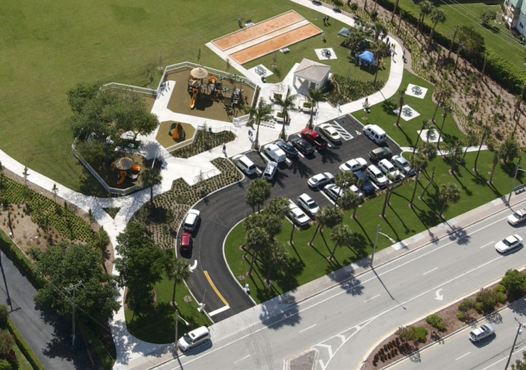 Complementing the improved pedestrian circulation, the park features durable Florida-native landscaping, including celebration sod, palm trees, and drought-tolerant shrubs, supported by an updated irrigation system. The addition of pedestrian-scale decorative lighting, public art, curved planter seat walls, and a suite of park furniture—such as benches, café tables, a drinking fountain, and bike racks—creates a welcoming and well-appointed civic space. Completed in just two months, the revitalization blends aesthetic charm with durable, community-centered design.