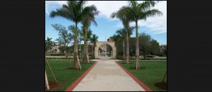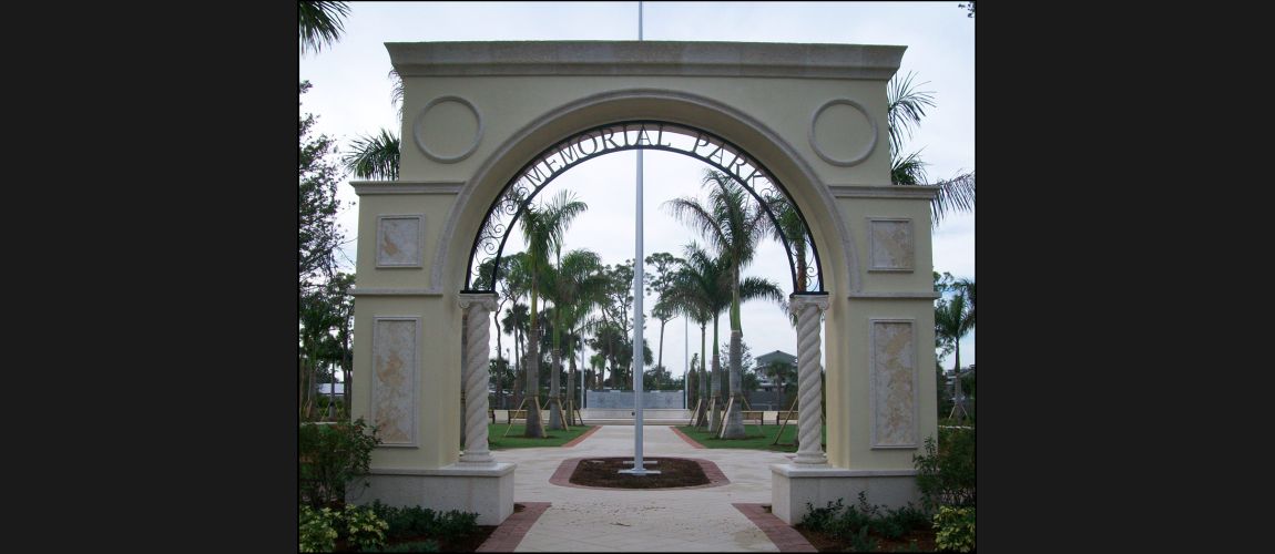 A large arch close to East Ocean Boulevard marks the new main park entrance and leads to the ceremonial plaza. The plaza has six flagpoles; one for the American flag near the arch and five on stage for the main military service flags – Army, Air Force, Navy, marines and Coast Guard.